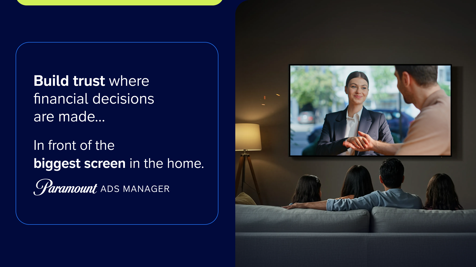 Whether you’re focused on new client acquisition, customer retention, or brand trust, Paramount Ads Manager makes it easy to bring marketing for banks and financial institutions into the CTV era.